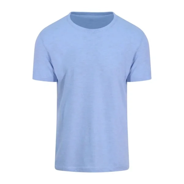99% cotone, 1% poliestere. T-shirt unisex dalla vestibilità moderna, tessuto effetto cenere, cuciture doppie sulle maniche e sul fondo, girocollo a costine.